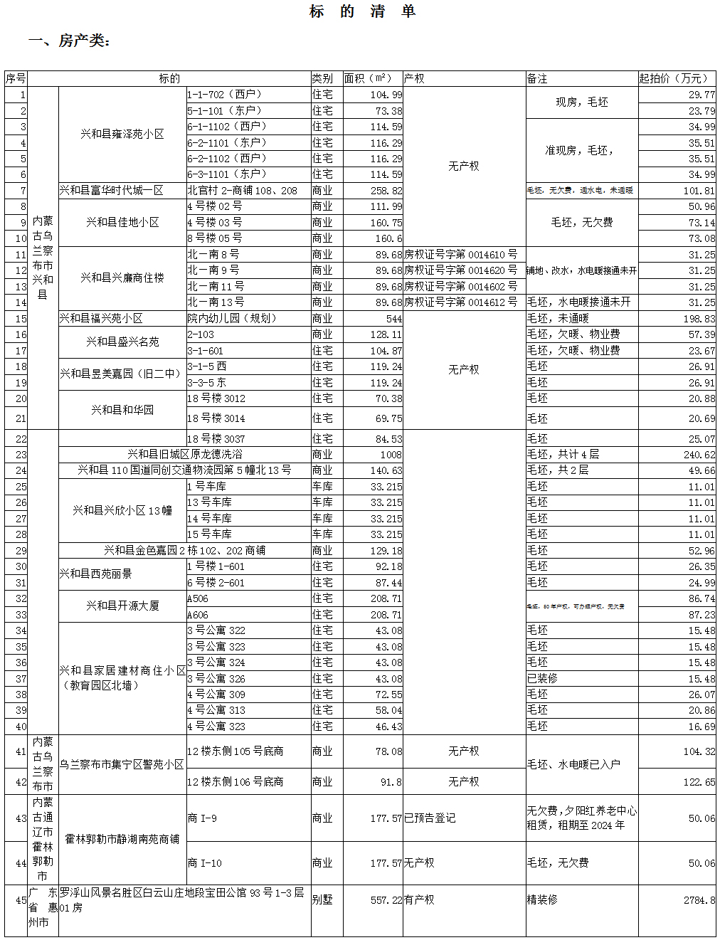 烏蘭察布市、通遼市、廣東省惠州市房產及金條拍賣公告 受委托,我公司將于2021年11月26日上午10:30在興和縣國際大酒店及中拍平臺公開拍賣興和縣財政局收回違規違法資產,標的詳情如下: